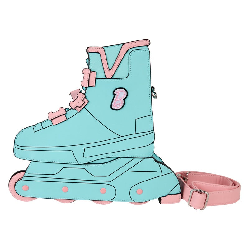 This crossbody bag is in the shape of a blue rollerblade inline skate! The Barbie "B" logo is embroidered on the side, and you'll find pink wheels that actually move!