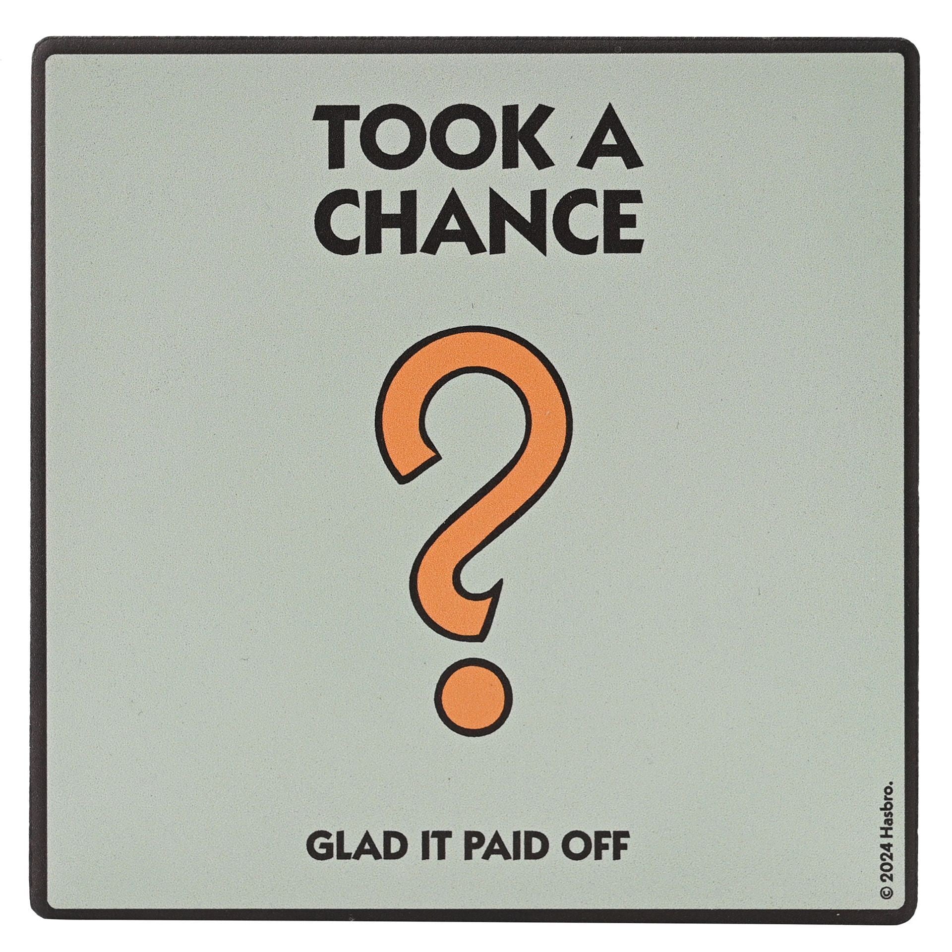 Excite board game enthusiasts, collectors, and Monopoly superfans alike, with this Monopoly Square Coaster in Ceramic & Cork Finish – ‘Took a Chance’, by HASBRO. Comes with a glazed finish and has been expertly designed to resemble a space on the actual gameboard. An ideal gift for congratulating a loved one. This is a perfect addition to any store’s selection of Monopoly merchandise. Why not sample the whole Monopoly collection today which includes mugs, key rings, and a photo frame.