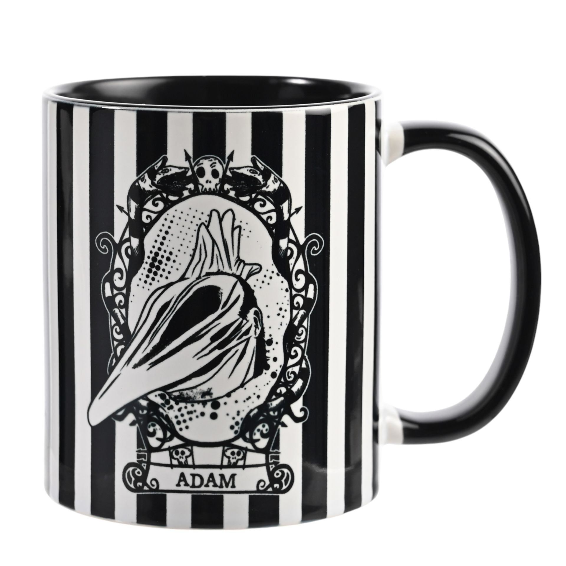 Celebrate the release of the new 2024 Beetlejuice movie, with an 11oz mug from the brand-new Beetlejuice range. This Warner Bros Beetlejuice Striped Mug is crafted from durable ceramic with a glazed finish, it is both robust and visually pleasing. The mug has a black handle and black inside. The design features an illustration of Adam Maitland, depicted with a stretched face like in the scene from the original movie. This is a perfect gift or self-purchase for any Beetlejuice fanatic.