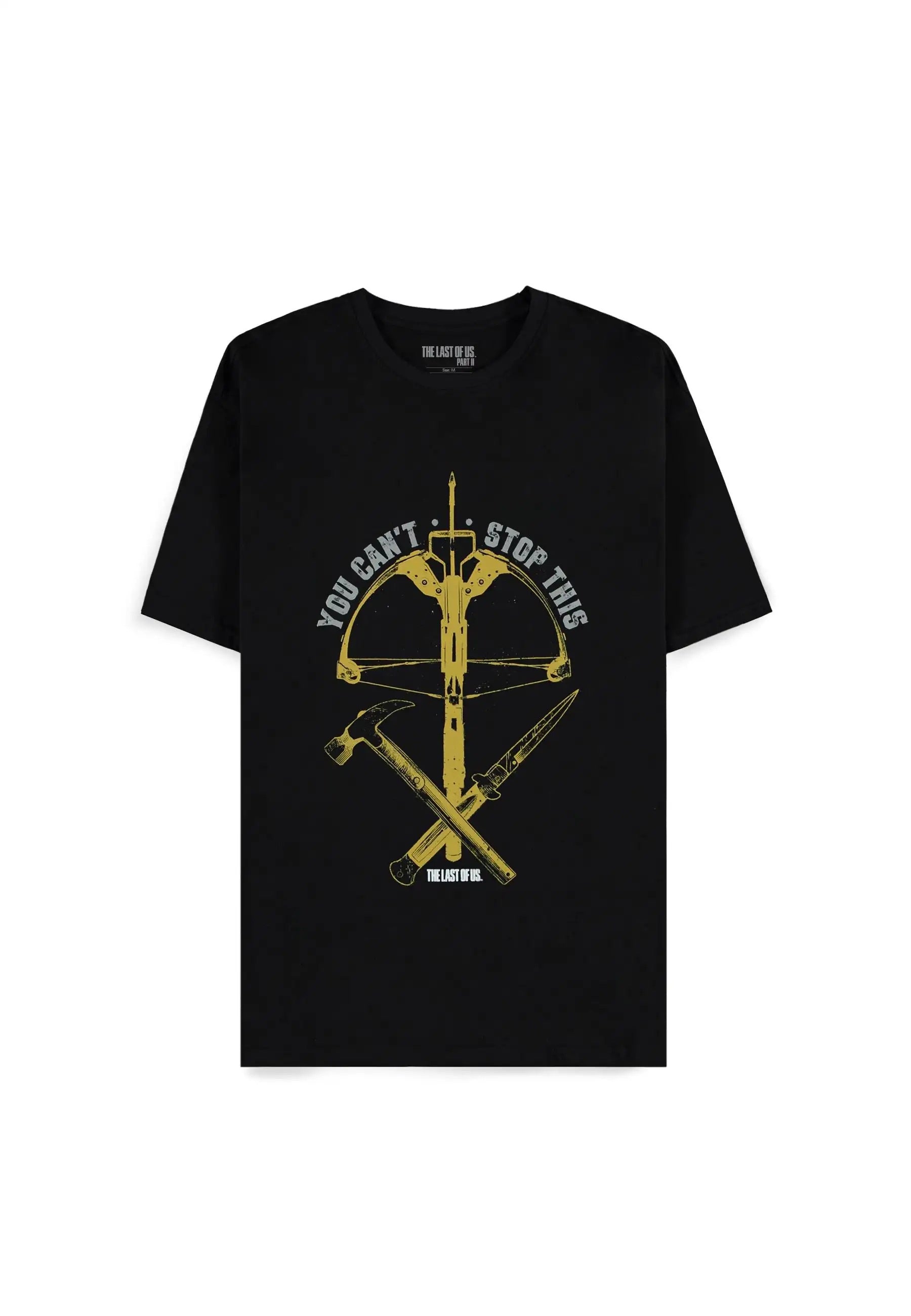This officially licensed The Last of Us merch is weaponized nostalgia—available for wholesale across the EU and UK and styled for retail impact. Printed on 100% black cotton, this The Last of Us t-shirt features a bold central graphic with crossbow, hammer, and switchblade arranged in an apocalyptic crest. Arched over the top is the game’s infamous quote: “You Can’t Stop This.” With the franchise logo grounding the design, this tee pulls its visual cues straight from the most iconic elements of the series.
