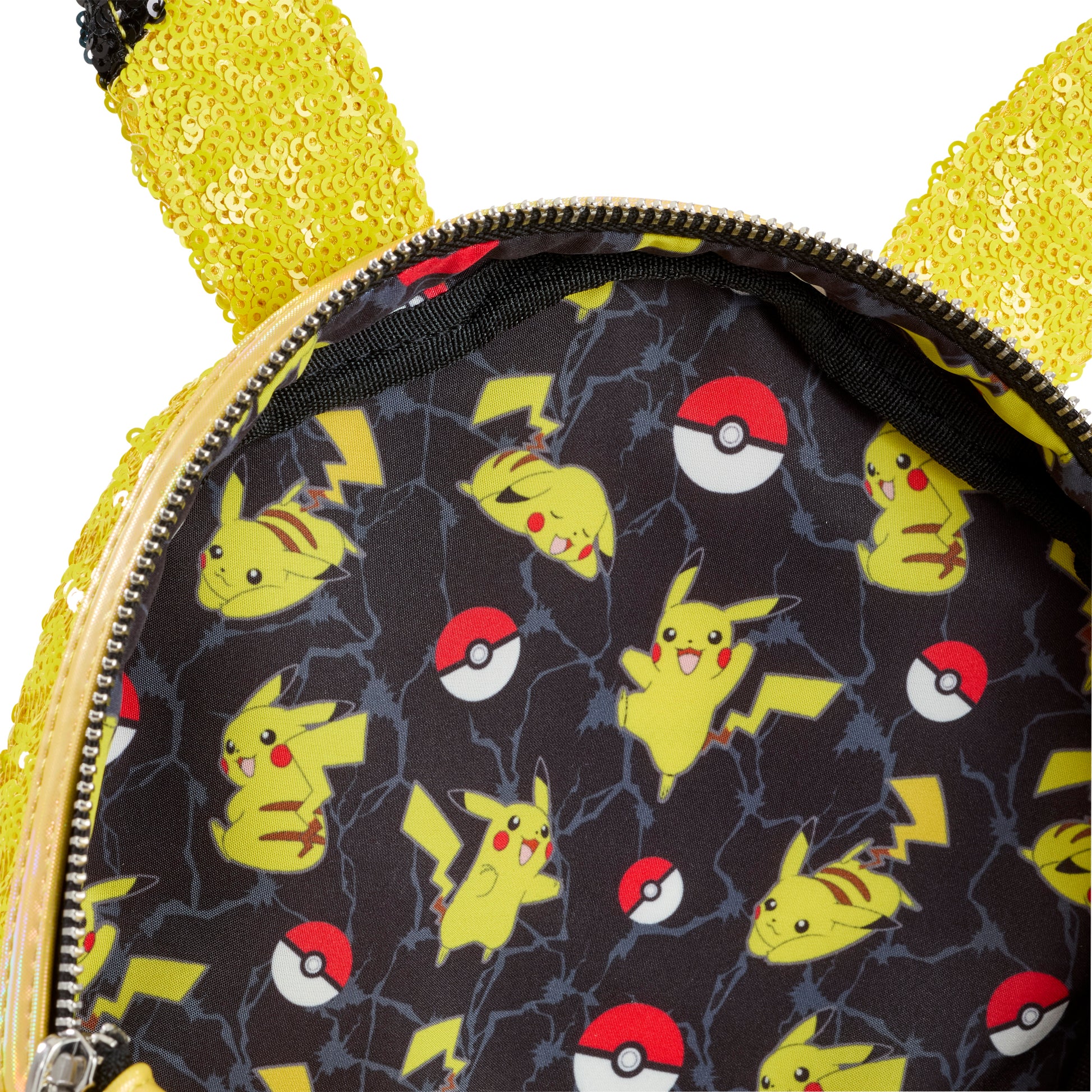 The choice is yours! Continue your dream of becoming a Trainer by calling Pikachu to join your next adventure. With plenty of room to hold your gear, this mini backpack will keep you prepared for any challenge that comes your way. Features: Vegan leather (polyurethane) with sequin trim Adjustable shoulder straps Front zipper pocket Side drop pockets Shiny silver hardware Enamel zipper charm Applique, embroidered, iridescent, and printed details Coordinating inside lining Dimensions: 9”W x 10.5”H x 4.5”D This backpack is an officially licensed Pokémon product.