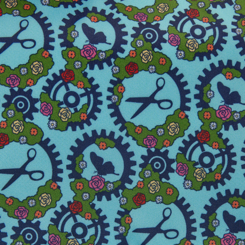 This crossbody bag features sherpa details modeling a hedge. It covers the front flap and there's a padded applique in the shape of a serpent. Embroidered roses cover the front flap and there's a heart-shaped cutout in the center. In the bottom corners, you'll find molded metal charms of Edward's scissor hands. A debossed pattern of gears against saffiano faux leather brings the whole look together.