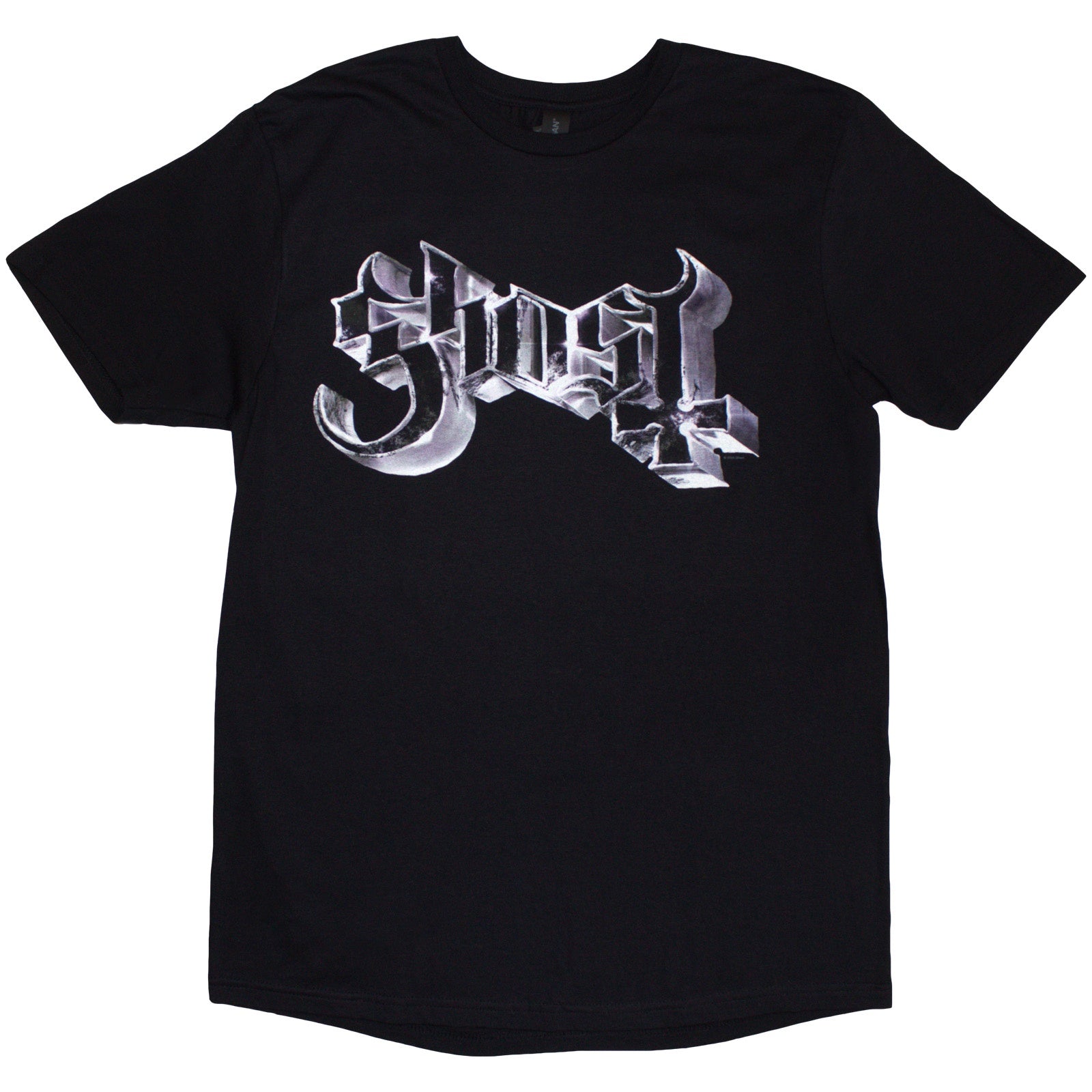 An official licensed Ghost T-Shirt featuring the Metal Logo & Purple Grucifix design motif.